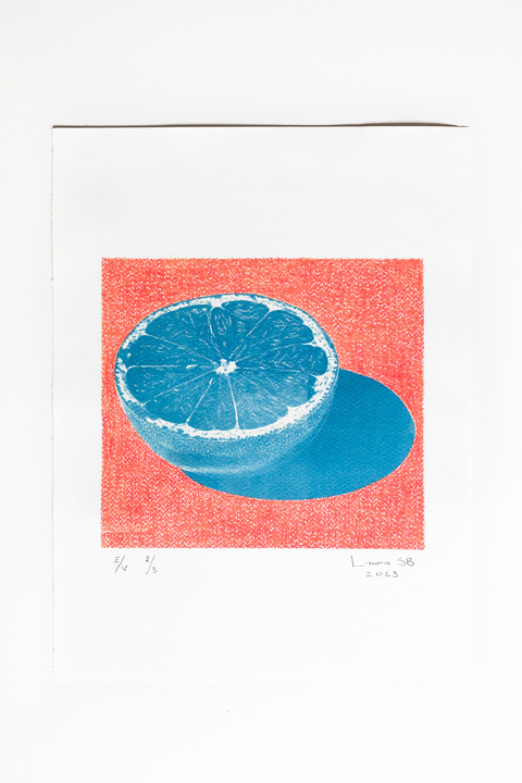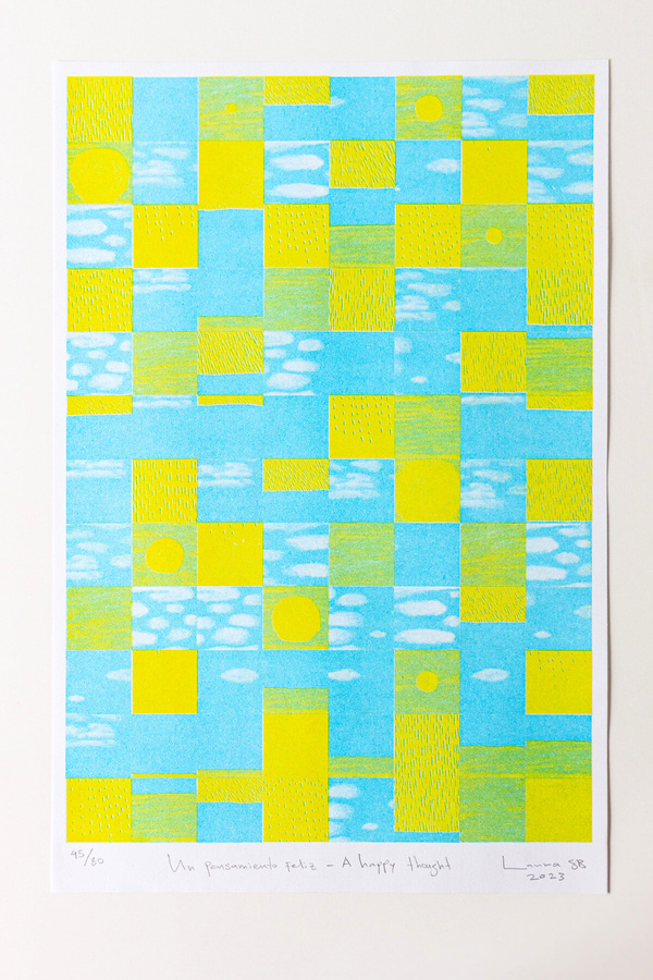 I am interested in different printing techniques, one of them being risography. These are 2 editions of risograph prints in February 2023, one using the frames of an amateur animation I made during 2022 called A happy though. The second, Paso Profundo, was made out of a photography I took thinking about difficult times and the need to step in the deep to move forward.