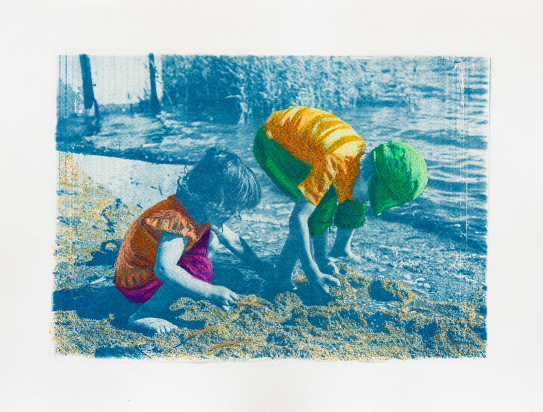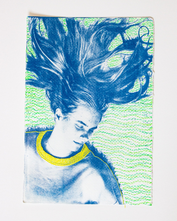 Cyanotype in watercolor paper, embroidery and oil pastel